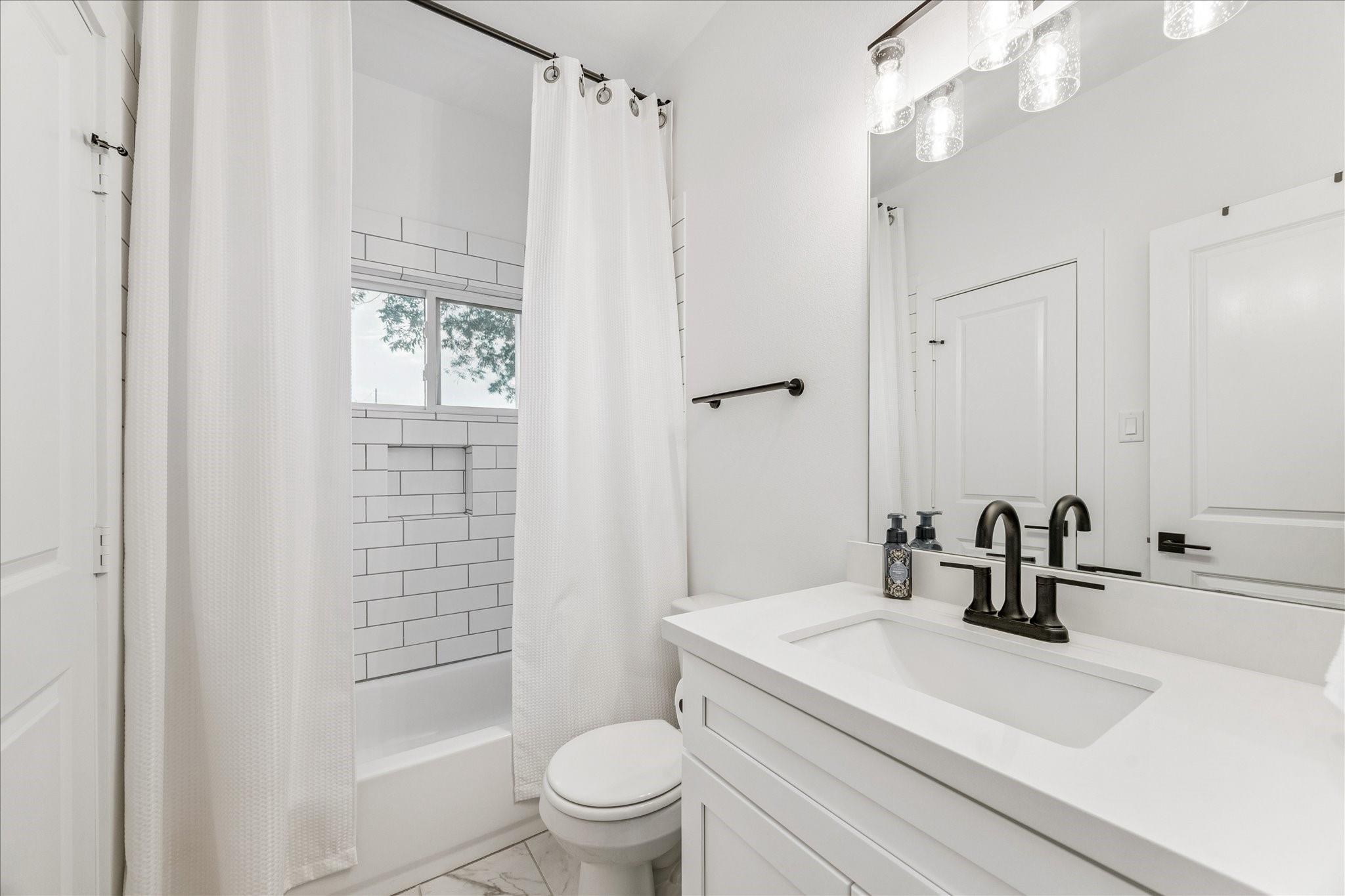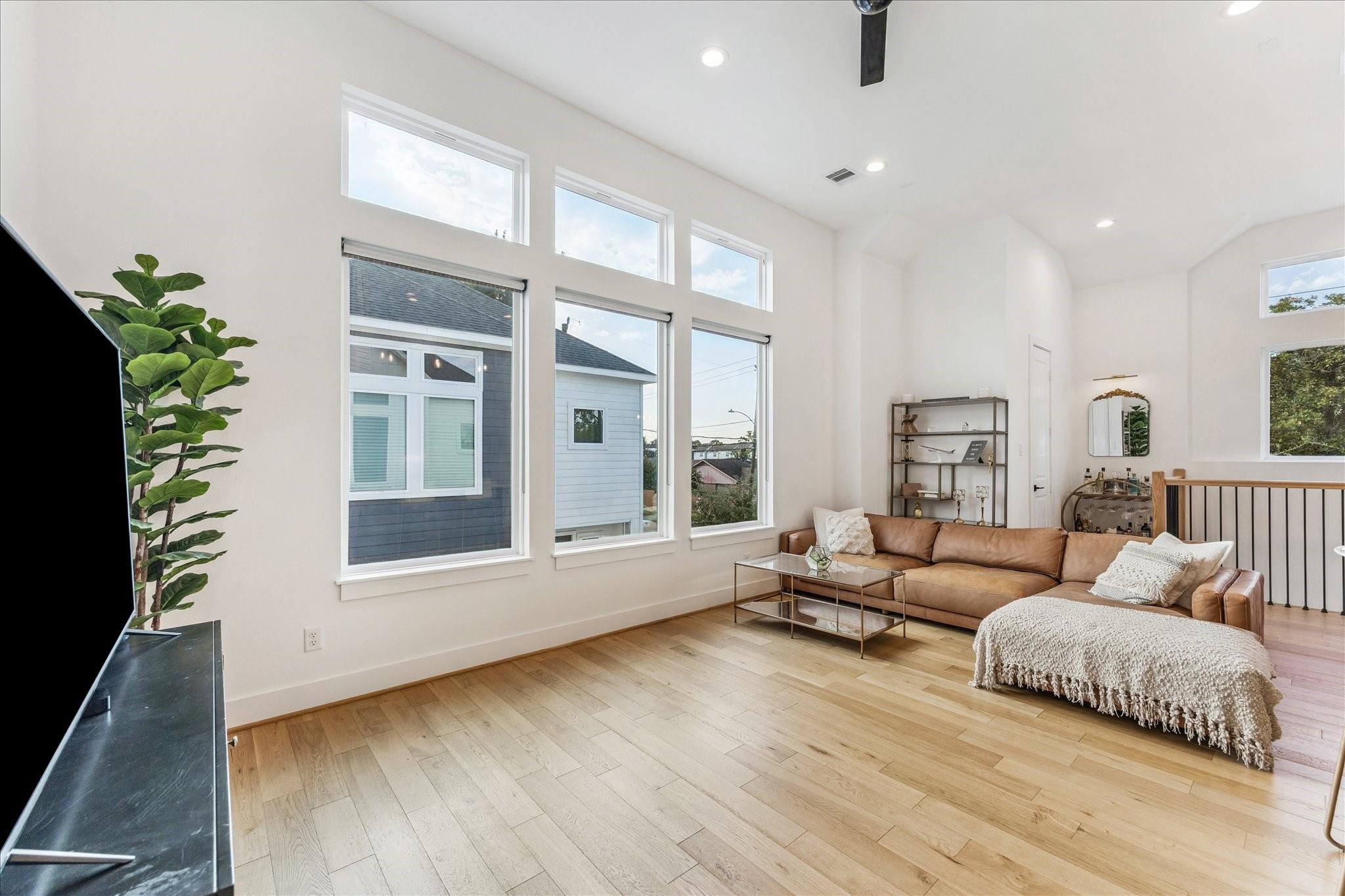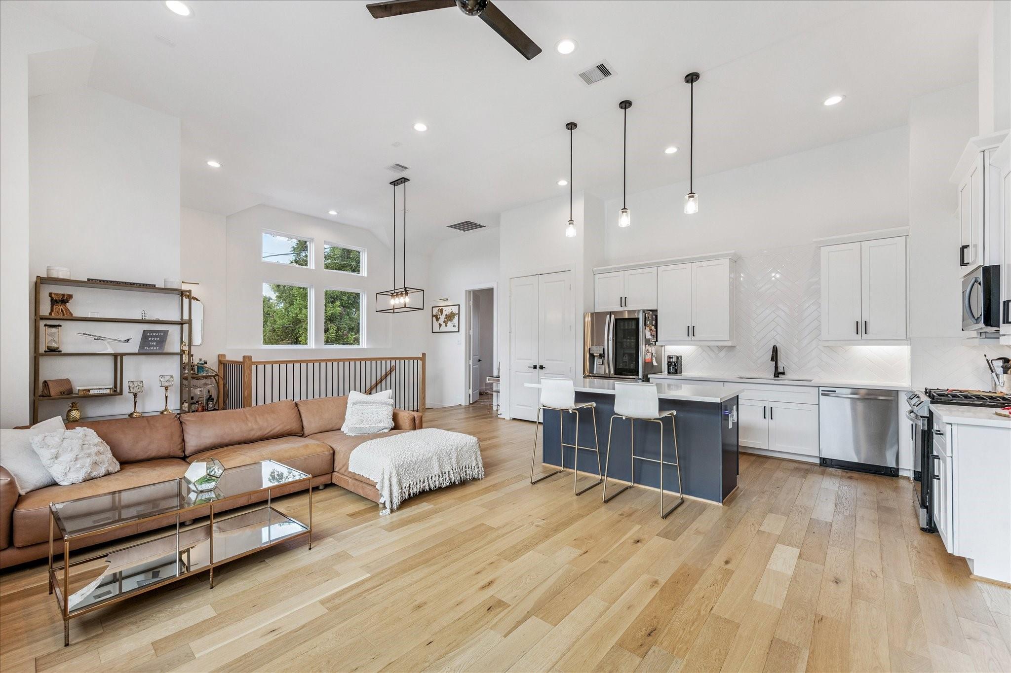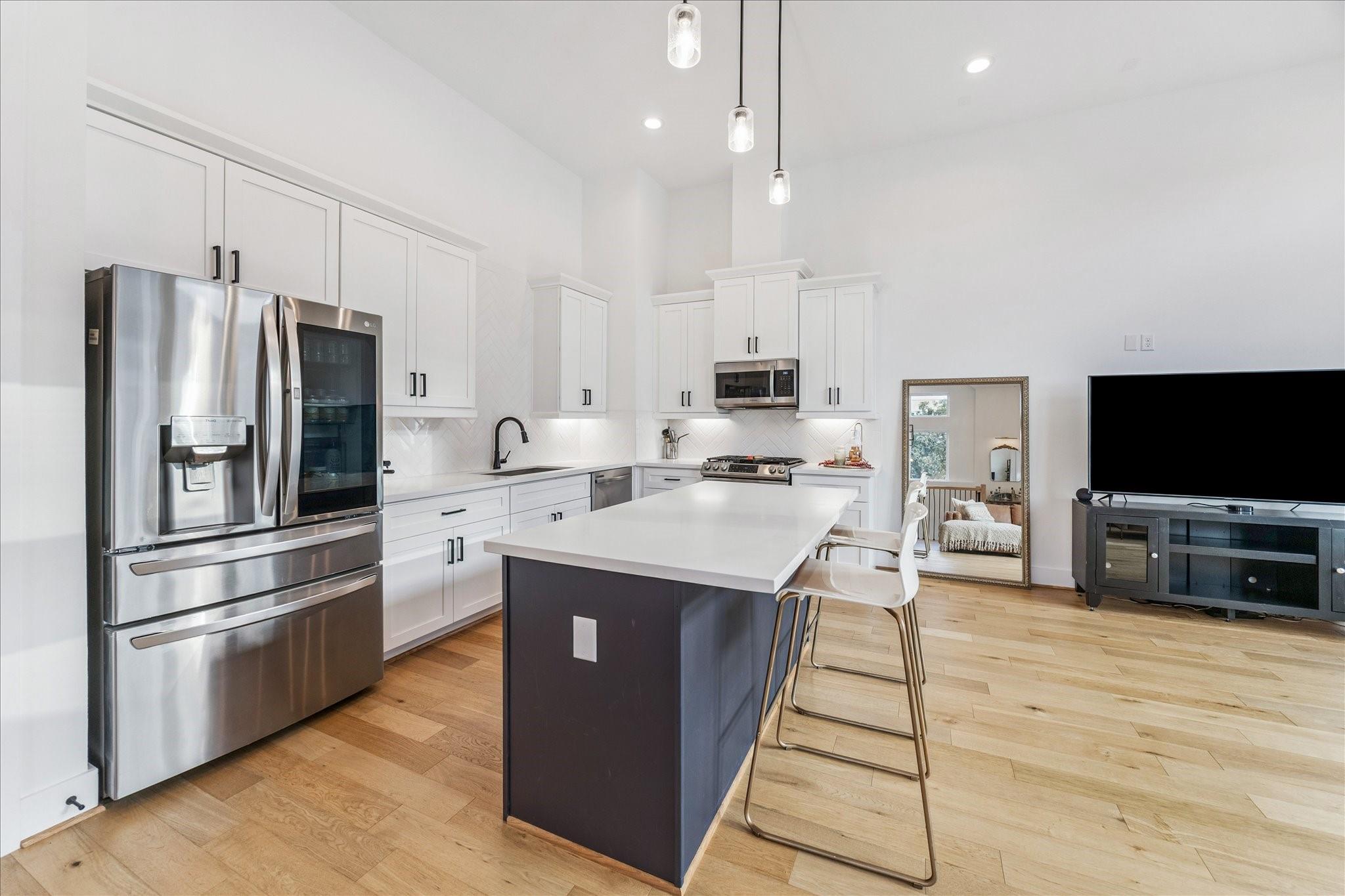 The first floor offers wood-look LVP flooring throughout, with two bedrooms connected by a Jack-and-Jill bath. Upstairs, 12-foot ceilings and oversized windows brighten the open living and dining areas. The kitchen is complete with quartz counters, shaker cabinets, herringbone backsplash, and a stainless steel appliance package.