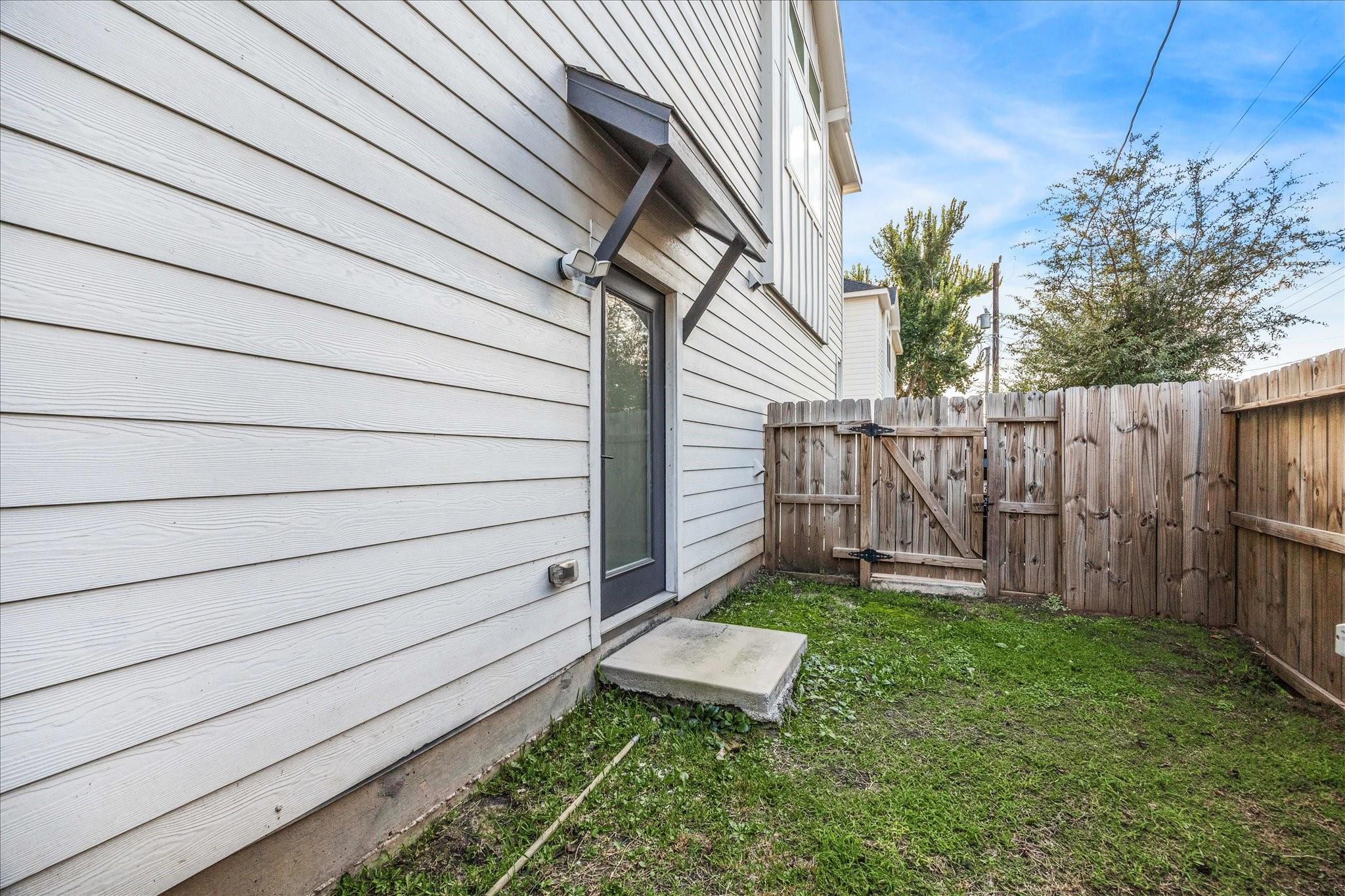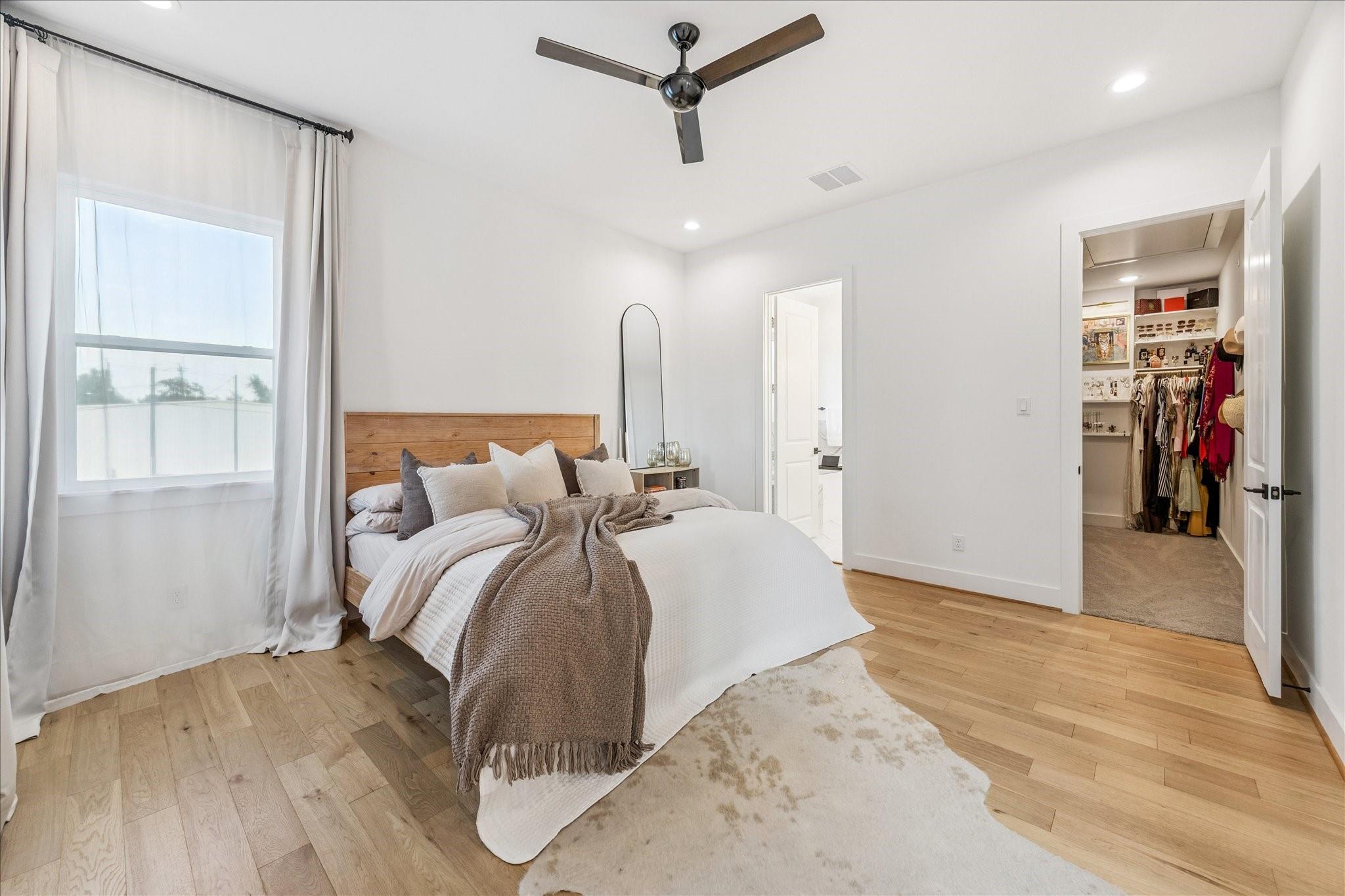 The top floor hosts the primary suite with a walk-in closet and spa-like bath featuring dual vanities, a soaking tub, and frameless glass shower. A bonus room provides space for an office, gym, or playroom, while the private yard adds valuable outdoor living.