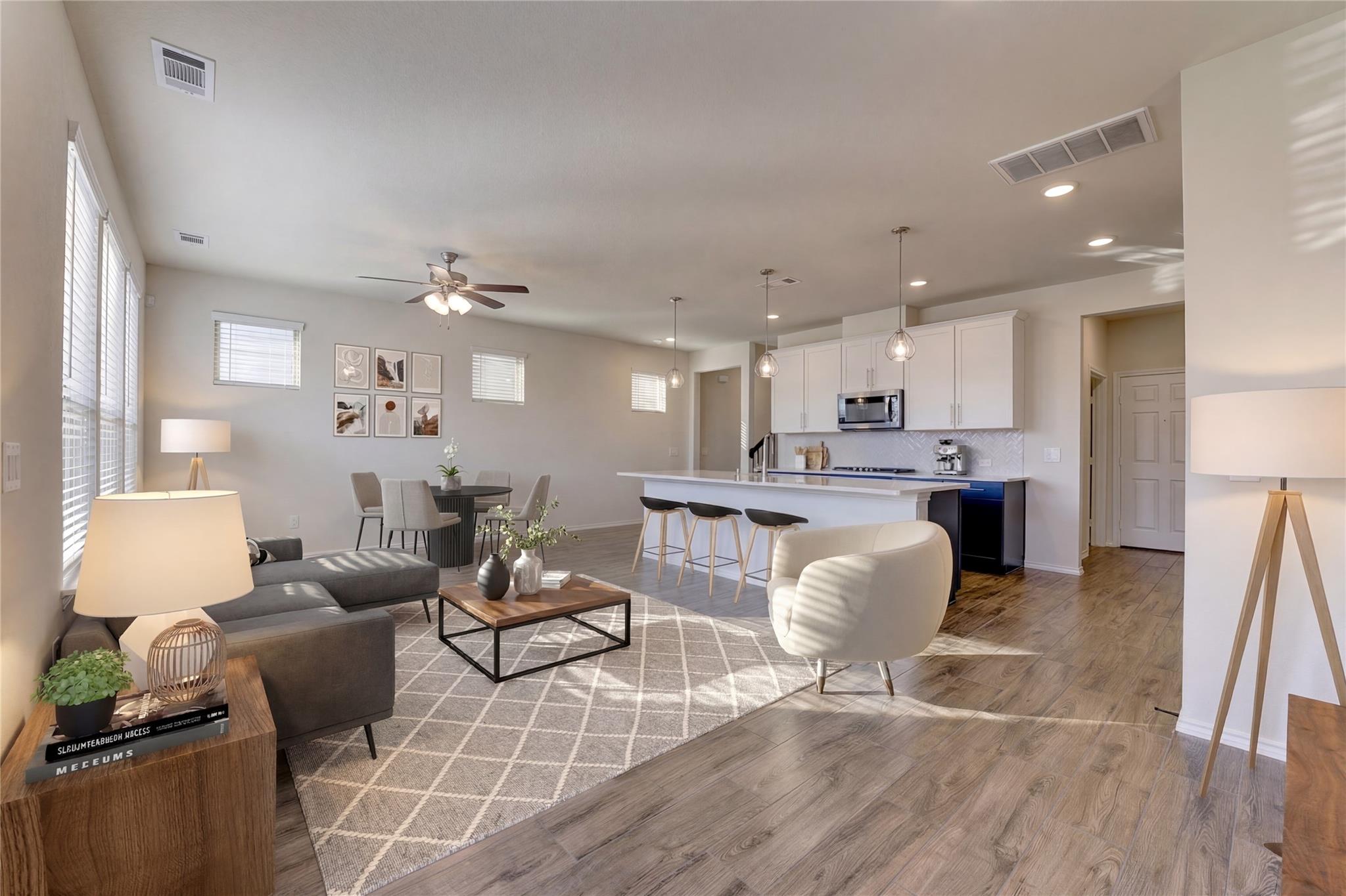 Located just 8 minutes from the Texas Medical Center, 10504 Marston Vineyard sits within the gated Avondale on Main community and offers a thoughtful balance of comfort and efficiency, all outside the flood zone. The first floor features wood-look tile throughout and an open layout where a spacious kitchen with ample counter space and storage flows seamlessly into the living and dining areas, making it ideal for both everyday living and entertaining. Dark-stained oak stair treads lead upstairs to a private primary suite set apart from the secondary bedrooms, along with a centrally located, generously sized utility room for added convenience. Freshly steam-cleaned carpet gives the home a clean, move-in-ready feel. Just minutes from Hermann Park, Wildcat Golf Club, and close to local favorites like Bunslut, El Tiempo, Tamashi Ramen, 7 Spice, and more.